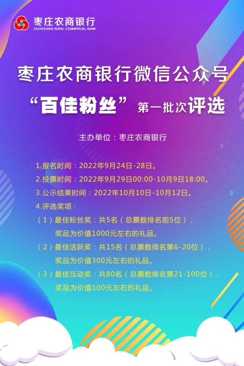 棗莊農商銀行微信公眾號“百佳粉絲”評選活動開始報名啦!