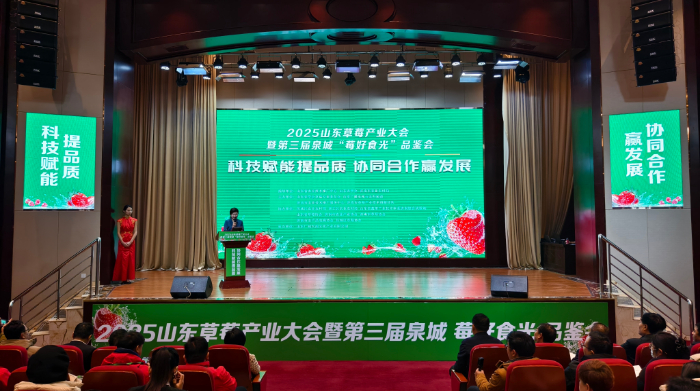 2025年1月10日至11日,由山東農學會草莓專業(yè)委員會、山東廣播電視臺農科頻道、濟南市農業(yè)技術推廣服務中心共同主辦的2025年山東草莓產業(yè)大會暨第三屆中國•泉城“莓好食光”品鑒會在濟南召開。本次大會以“科技賦能提品質 協(xié)同合作贏發(fā)展”為主題,旨在搭建草莓生產全產業(yè)鏈的交流與交易平臺,探討草莓產業(yè)前沿品種、技術及市場發(fā)展趨勢。山東省農業(yè)農村廳黨組成員、副廳長楊武杰、濟南市農業(yè)農村局黨組書記、局長孟帥、山東農學會秘書長張希軍等出席了會議。來自全國各地的草莓專業(yè)合作社、種植基地、采購企業(yè)、農資及設施企業(yè)負責人等300余人參加了此次盛會。