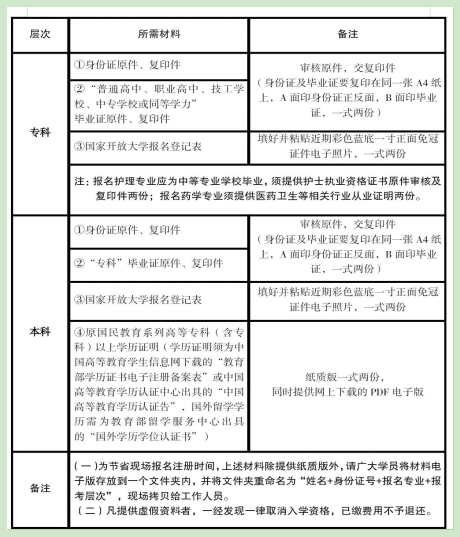 【查驗(yàn)證件】——【填寫國家開放大學(xué)報名登記表(也可提前自行下載打印電子版填好)】——【在“國家開放大學(xué)統(tǒng)一身份認(rèn)證平臺”錄入報名信息】——【打印報名信息表后本人核對簽字確認(rèn)】——【掃碼采集新生照片】——【在線繳費(fèi)(具體學(xué)費(fèi)以山東開放大學(xué)開放教育在線繳費(fèi)平臺為準(zhǔn),屆時如繳費(fèi)系統(tǒng)不開放,繳費(fèi)事宜則另行通知)】——【掃碼加入新生微信群】